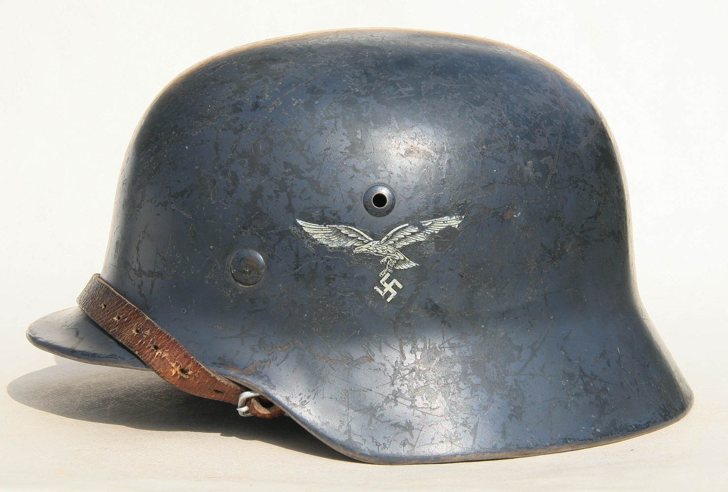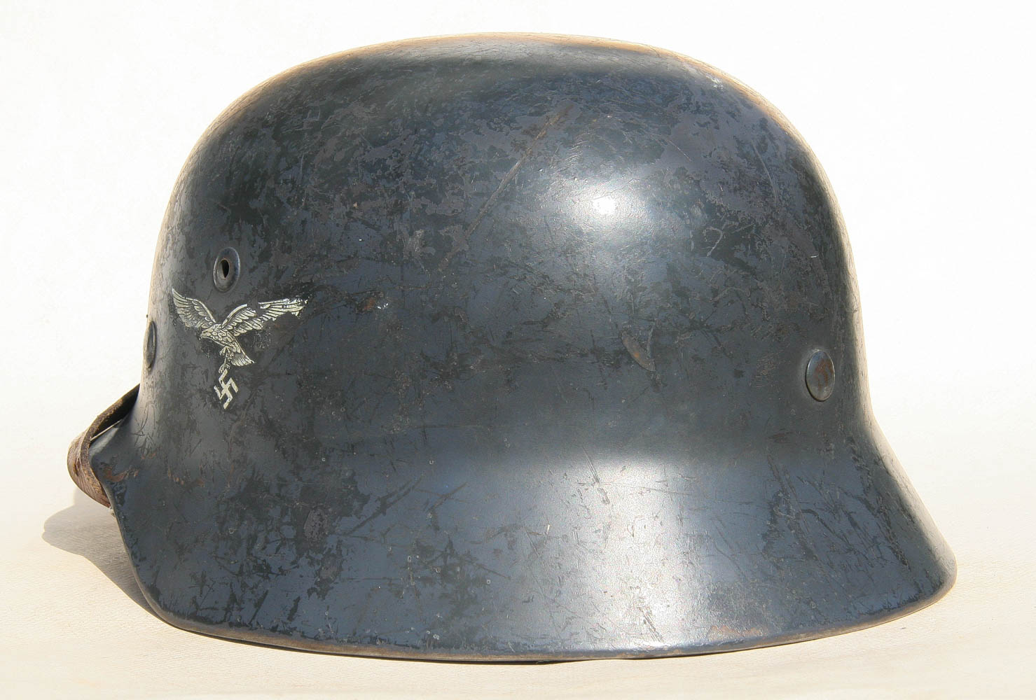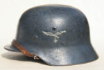 Item H745: Exterior displays a factory schiefergrau overpaint leaving the Luftwaffe adler decal exposed and covering the National tri-color decal. The repaint is also visible along the edge of the reinforced aluminum liner band. Liner system 100% original to the helmet. Reinforced aluminum liner band is dated 1938. All three untouched split pin rivet fasteners intact and complete with all three slotted washers. Leather liner is undamaged, fully pliable and has taken on a darkened aged appearance. Drawstring in full length with original factory knot still in place. Buckle end of chinstrap is aluminum. Long portion of strap has been shortened an inch or two to accommodate the fitment of the German soldier. Partial quality control ink stamp visible on interior crown of helmet. Overall very good condition.