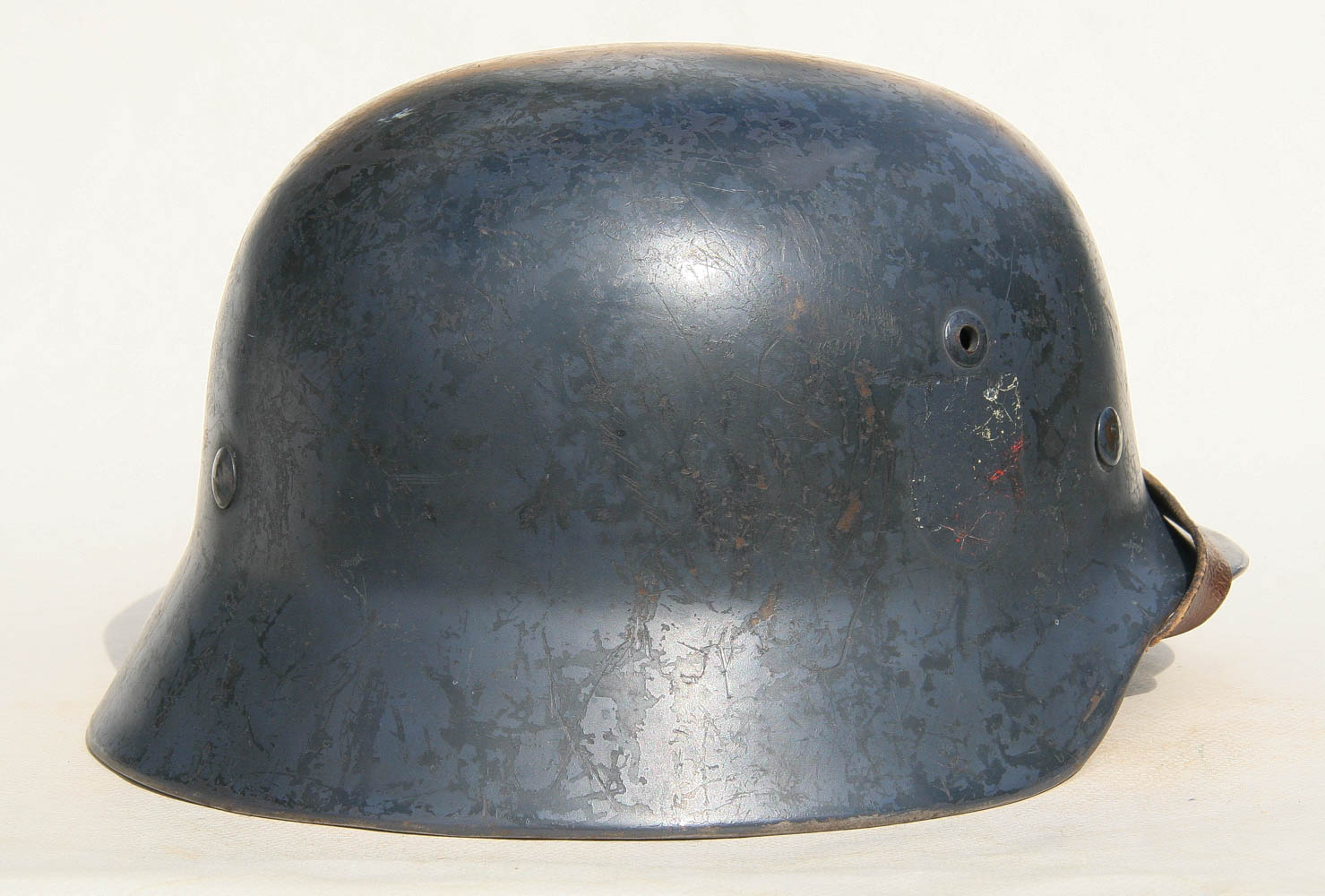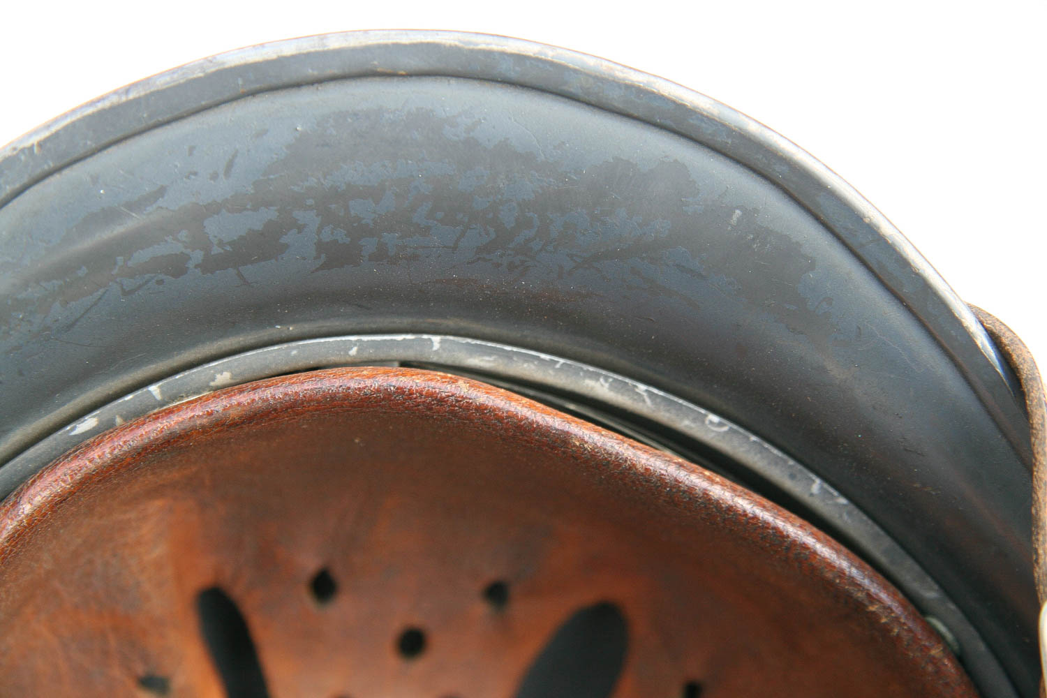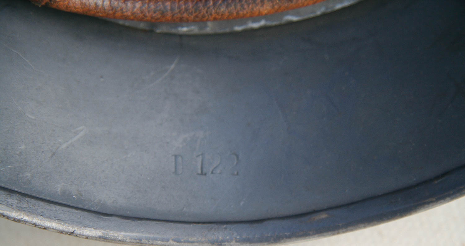 Item H741: Exterior displays extremely light wear with almost all of the factory “Blaugrau” blue gray rough texture aluminum oxide granule paint present. Authentic and factory applied Luftwaffe adler decal is commensurate with the overall wear and rates approx. 98%. Super tight fitting liner system 100% original to the helmet. All three untouched split pin rivet fasteners intact and complete with all three slotted washers. Leather liner intact but has a few mouse nips. Overall excellent condition.