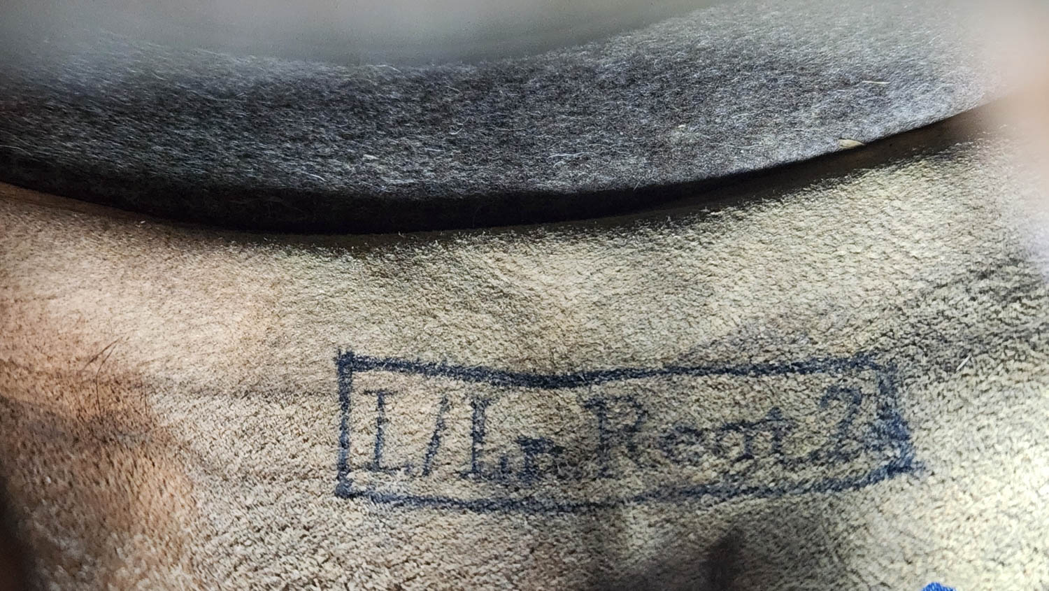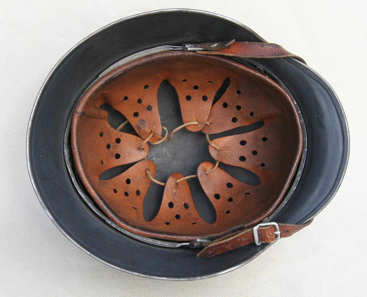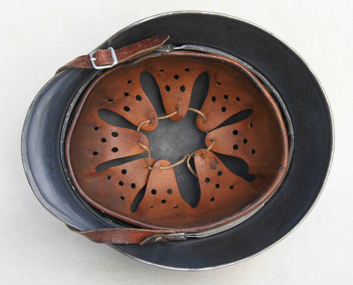 Item H741: Exterior displays extremely light wear with almost all of the factory “Blaugrau” blue gray rough texture aluminum oxide granule paint present. Authentic and factory applied Luftwaffe adler decal is commensurate with the overall wear and rates approx. 98%. Super tight fitting liner system 100% original to the helmet. All three untouched split pin rivet fasteners intact and complete with all three slotted washers. Leather liner intact but has a few mouse nips. Overall excellent condition.