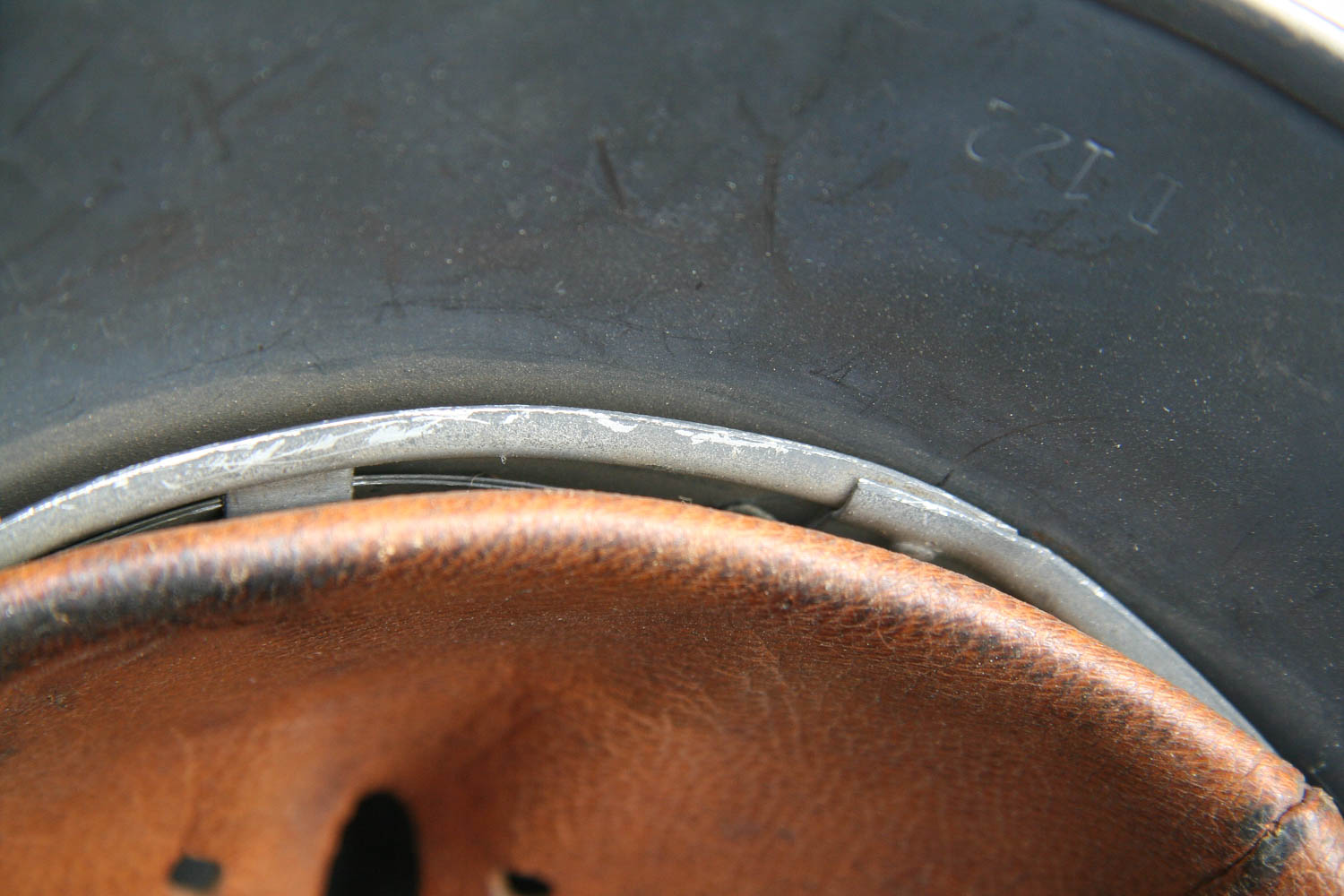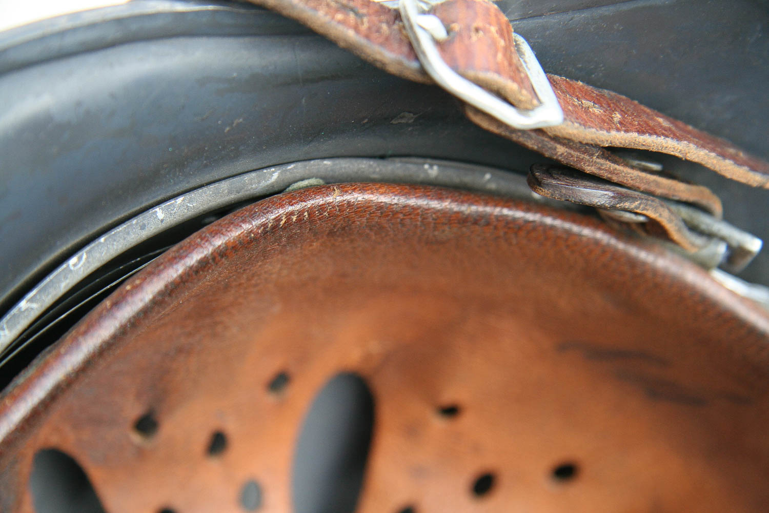 The helmet is in good overall condition. Super tight fitting liner system 100% original to the helmet. All three untouched split pin rivet fasteners intact and complete with all three slotted washers. Leather liner is pliable with 2 broken tabs are all there and can be repaired if the new owner wishes to do so. Drawstring in full length with original knot in place.