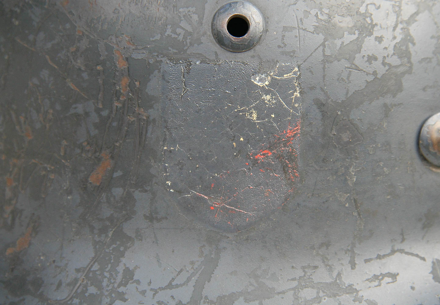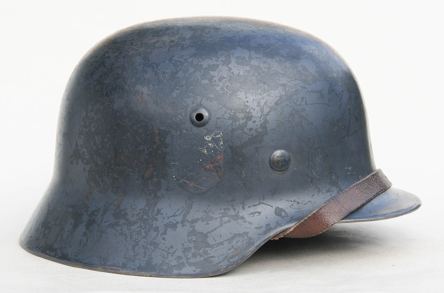 Item H731: Exterior displays a WW2 period applied re-paint exposing only the Heer decal as per a 1940 directive. The factory applied Heer adler decal rates approximately 92%. Tight fitting liner system 100% original to the helmet. All three untouched split pin rivet fasteners intact and complete with all three slotted washers. Reinforced aluminum liner band dated 1938. Leather liner is undamaged, fully pliable and has taken on a darkened aged appearance. Overall very good condition.