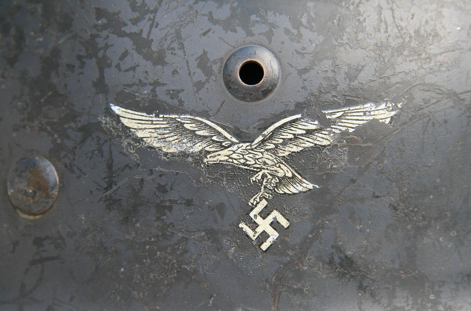 Item H705: Exterior displays moderate wear with approx. 95% of the factory paint remaining. Authentic and factory applied Luftwaffe adler decal commensurate with the overall wear. Super tight fitting liner system 100% original to the helmet. All three untouched split pin rivet fasteners intact and complete with all three slotted washers. Leather liner is undamaged, fully pliable and has taken on a darkened aged appearance. Drawstring is in full length with original factory knot still in place. Overall good condition.