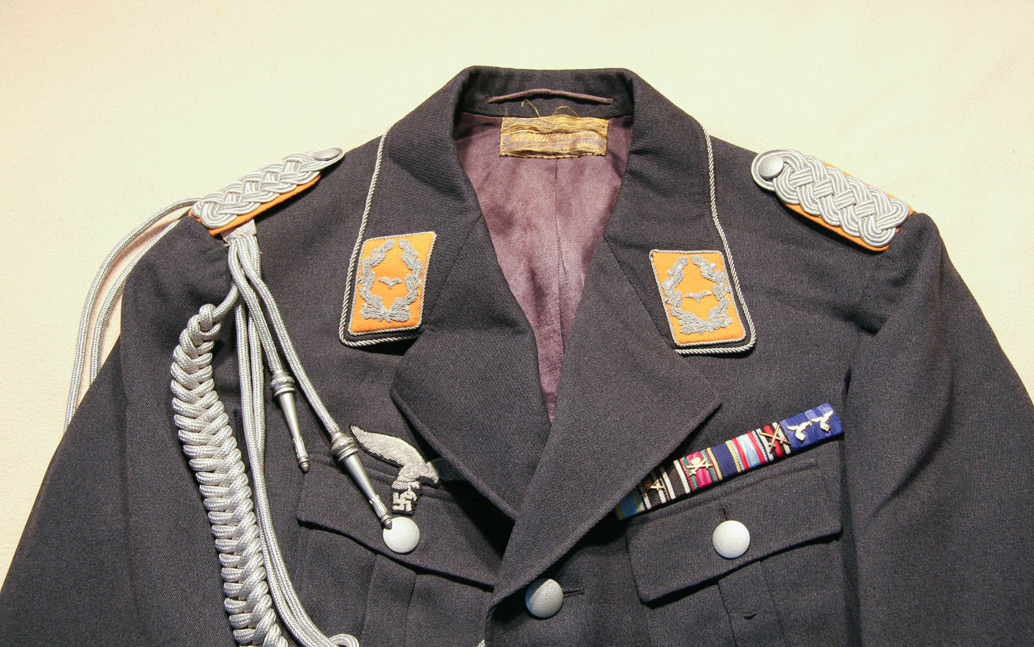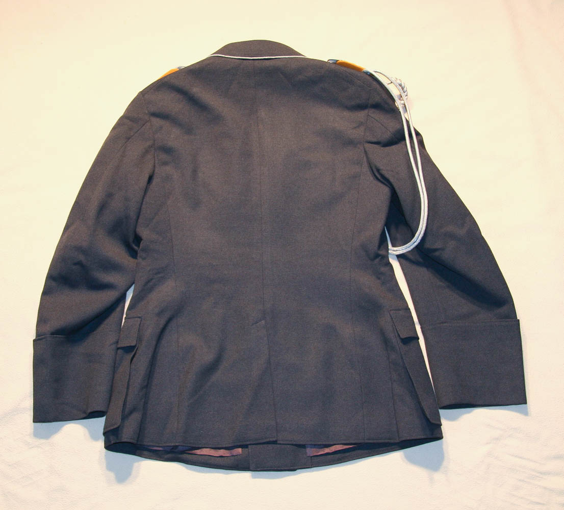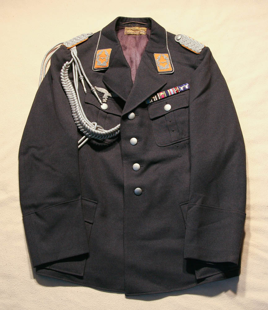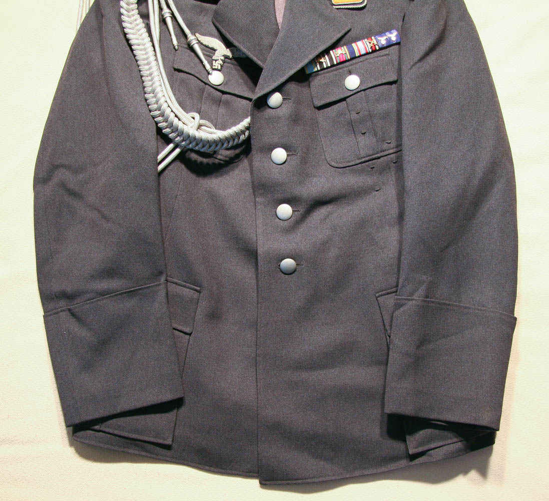 Item H746: Exceptional tunic in near mint condition. Zero mothing. Major rank tunic in gray wool with early 1935 four pocket tailoring. All aluminum pebbled buttons firmly attached. Authentic aluminum bullion Luftwaffe adler insignia in perfect condition as are the original collar tabs and shoulder boards. Beautiful authentic lanyard aiguillette over right shoulder. Ribbon bar is a reproduction. Manufacturer tag sewn inside neck area. Gray silk lining shows no rips or tears. Personal tag sewn inside the the breast pocket which belongs to a Major Althaus 1935. The only wear is the manufacturer tag. Other than that, the overall condition is excellent.