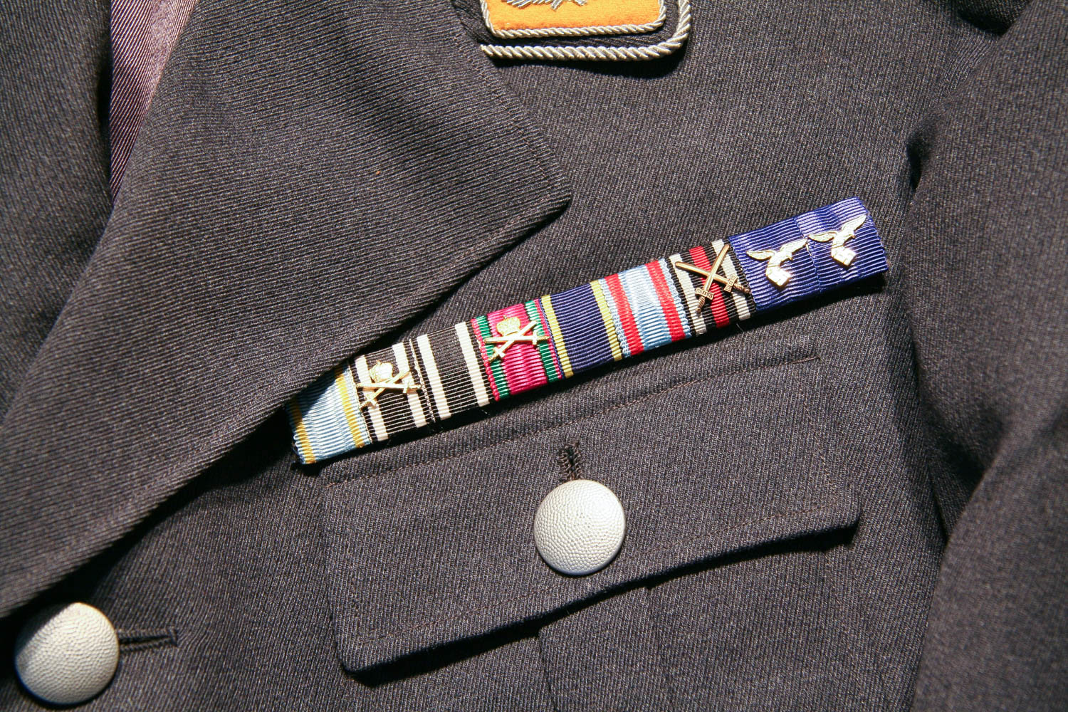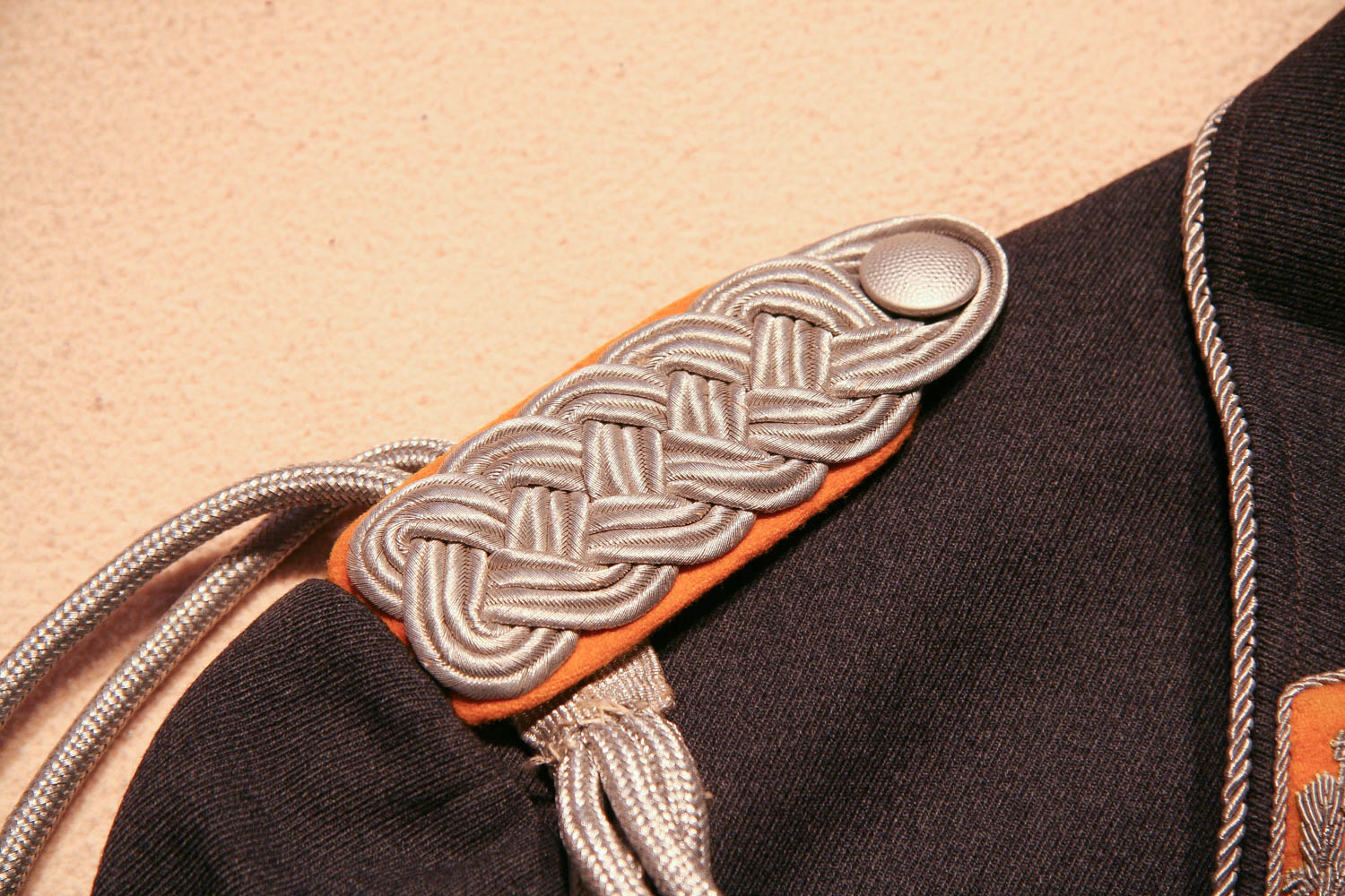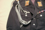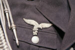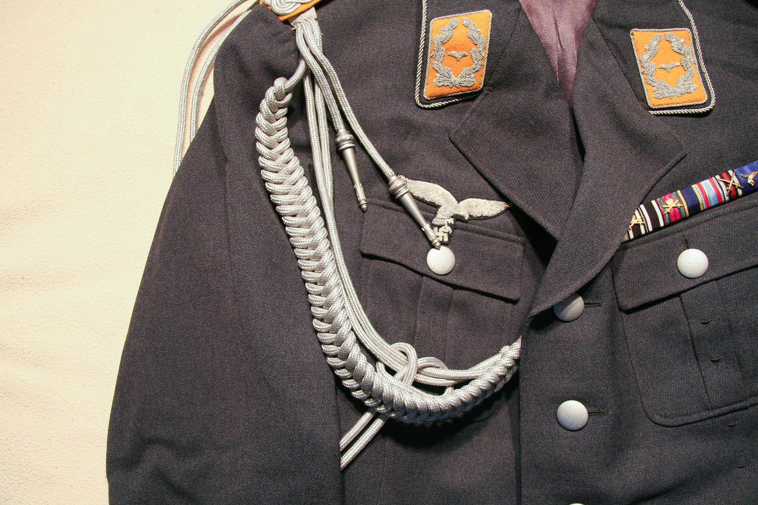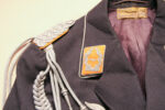 Item H746: Exceptional tunic in near mint condition. Zero mothing. Major rank tunic in gray wool with early 1935 four pocket tailoring. All aluminum pebbled buttons firmly attached. Authentic aluminum bullion Luftwaffe adler insignia in perfect condition as are the original collar tabs and shoulder boards. Beautiful authentic lanyard aiguillette over right shoulder. Ribbon bar is a reproduction. Manufacturer tag sewn inside neck area. Gray silk lining shows no rips or tears. Personal tag sewn inside the the breast pocket which belongs to a Major Althaus 1935. The only wear is the manufacturer tag. Other than that, the overall condition is excellent.