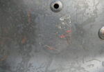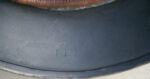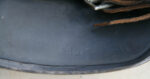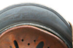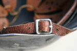 Item H698: This helmet displays the typical tri-color geometric camo pattern of WWI. It consists of the colors ox blood red, green and ochre which are all separated by a thick black border. The steel liner band is held in place by 3 rivets which are factory installed and undisturbed. The 2 front rivet heads are flatter than the rear rivet head all of which are correct for the time period. The 3 liner pads are all intact each with it’s pillow on the reverse. The leather chinstrap has been lost to time but the metal connectors are still fixed to the lugs. Overall very good condition.