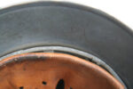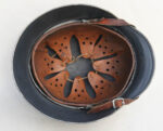 Item H695: These are becoming harder and harder to find because it is a perfect blank palette for the counterfeiters. It is a rear stamped Quist M40 which was issued from the factory with zero decals. The Third Reich only issued rear stamped Quist M40 helmets with decals on Combat Polizei helmets. Nothing else. If you encounter an M40 rear stamped Quist with decals other than Polizei decals it’s a fake. Anyway, Super tight fitting liner system 100% original to the helmet. All three untouched split pin rivet fasteners intact and complete with all three slotted washers. Pig skin leather liner is undamaged, fully pliable and has taken on a darkened aged appearance. Drawstring in full length with original factory knot still in place. Buckle end of chinstrap is steel. Long portion of strap is fully pliable but has been cut down about an inch to accommodate the soldier which was not uncommon. Overall excellent condition.