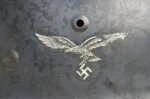 Item H740: Top shelf example. Exterior displays extremely light wear with almost all of the factory “Schiefergrau” slate gray paint present. Authentic and factory applied Luftwaffe adler decal is commensurate with the overall wear and rates approx. 98%. Super tight fitting liner system 100% original to the helmet. All three untouched split pin rivet fasteners intact and complete with all three slotted washers. Lamb skin leather liner fully intact. Drawstring in full length with original factory knot still in place. Buckle end of chinstrap is steel with approx. all of the gray paint intact. Long portion of strap in full length and pliable with a partial manufacturer name on tip. Overall excellent top shelf condition.