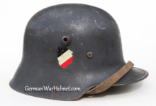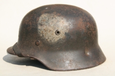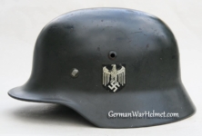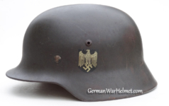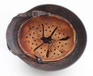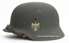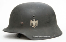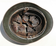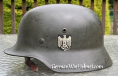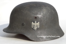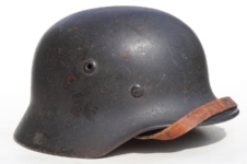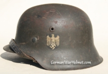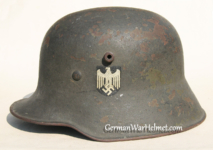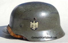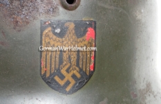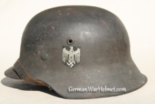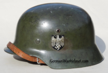 Item H617: Exterior displays average battlefield wear with approx. 85% of the factory paint remaining. Authentic and factory applied Heer adler decal commensurate with the overall wear. Super tight fitting liner system 100% original to the helmet. All three untouched split pin rivet fasteners intact and complete with all three slotted washers. Leather liner is undamaged, fully pliable and has taken on a darkened aged appearance. Buckle end of chinstrap is steel with approx. 50% of the gray paint remaining. Long portion of strap is in full length and pliable. Manufacturer and date on tip. Overall very good condition.Â
