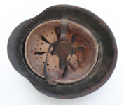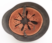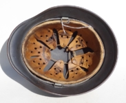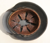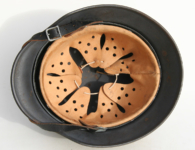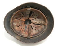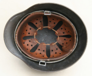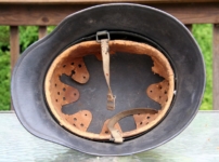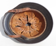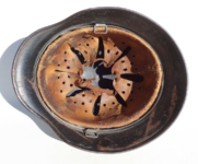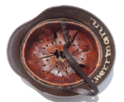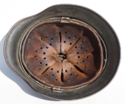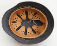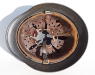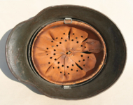 Item H576: Exterior displays a rough texture over paint with partial decal exposed. The outer circumference features a cotton covered copper wire which hooks onto both sides fixing it in place. Super tight fitting liner system 100% original to the helmet. All three untouched split pin rivet fasteners intact and complete with all three slotted washers. Goatskin leather liner relatively complete with only 2 broken eyelets for the drawstring The leather is fully pliable and has taken on a darkened aged appearance. The helmet is named in white paint on the rear of the flared edge to O. Gefr. Wirth which is an abbreviation for Obergefreiter or equivalent to Senior Lance Corporal. Overall very good condition.