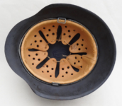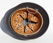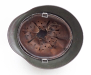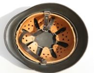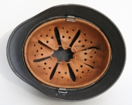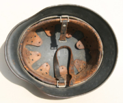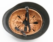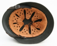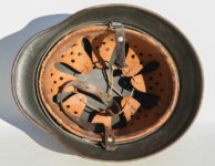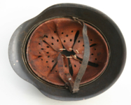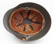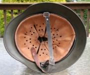Item H594: Exterior displays moderate wear with a good portion of the factory paint remaining. This helmet is a rear stamped Quist that came from the factory without a decal as they all did with the exception of Combat Police. Super tight liner system 100% original to the helmet. All three untouched split pin rivet fasteners intact and complete with all three slotted washers. Pig skin leather liner is undamaged, pliable and has taken on a darkened aged appearance. Buckle end of chinstrap is steel with approx 50% of the gray paint remaining. Long portion of strap is in full length and pliable. Manufacturer RBNr. code on tip. Overall excellent condition.