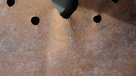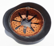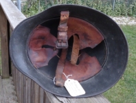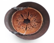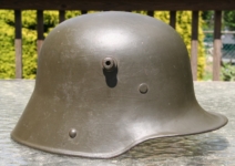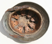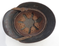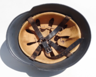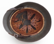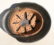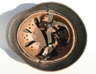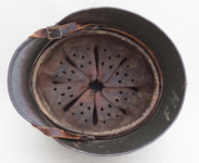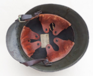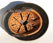 Item H475: This helmet is overall desirable and over 100 years old. Exterior displays a drab green paint. The left front rivet may be a period replacement. The two other rivets are factory correct. The leather liner is original and correct. Horse hair pads intact and attached to each liner band. Correct brass fittings on chinstrap ends. Brass buckle also correct. These helmets are becoming harder to find in such nice condition. Try and find an original brass fitting chinstrap for an M16 helmet.