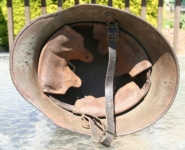 Item H564: Here is an M40 Mediterranean camo with an Afrika Korps tan sand paint as the base coat with regard to the camouflage. Over the DAK paint is a dark ochre with brown stripes. Exterior displays battlefield wear with approx 90% of the camo remaining. The Heer decal can be seen coming out from under the paint where is has worn down exposing a portion of the decal. Tight fitting liner system 100% original to the helmet. All three untouched split pin rivet fasteners intact and complete with all three slotted washers. Goat skin leather liner is undamaged, fully pliable and has taken on a darkened aged appearance. Leather was treated by a previous owner. Original drawstring in place. Buckle end of chinstrap is steel. Long portion of strap is pliable and missing an inch or 2 from the tip. It too has been treated by a previous owner. The helmet is nicely named to the German soldier in white paint on the rear of the flared edge. Overall condition is very good.