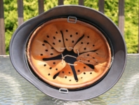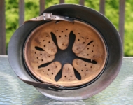 Item H523: Excellent top shelf condition inside and out. Exterior displays very light wear with approx 98+% of the factory schiefergrau (slate gray) paint remaining. Authentic and factory applied Luftwaffe adler decal commensurate with the overall wear and also rates approx 98+%. Super tight fitting liner 100% original to the helmet. All three untouched split pin rivet fasteners intact and complete with all three slotted washers. Reinforced aluminum liner band is dated 1941. I can not make out the manufacturer but the date is clear. This is a harder to find type liner because by that time zinc liner bands were being produced. This liner had to be the last of the early aluminum surplus to pass through the factory. Sheep skin leather liner is undamaged, fully pliable and still a creamy color in appearance. Drawstring in place.