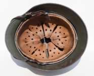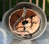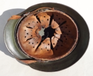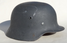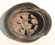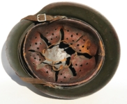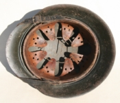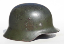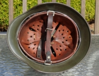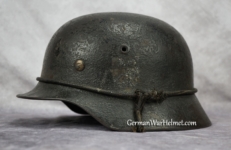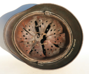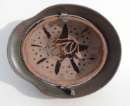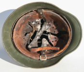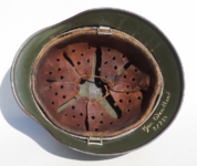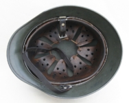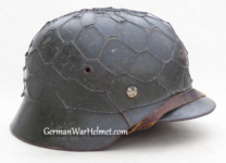 Item H556: Here is an authentic half basket chicken wire helmet. All the correct indicators shows that the wire and helmet have been married together since the war. There is the transfer of wear from wire to helmet. The wire shows oxidation which also transferred over to the helmet. The exterior surface of the helmet has been field repainted. The ghosting of Heer adler decal can be seen under the repaint. There is a small hole in the front of the helmet. I can not explain how or when it occurred. Tight fitting liner system 100% original to the helmet. All three untouched split pin rivet fasteners intact and complete with all three slotted washers. Goat skin leather liner is undamaged, fully pliable and has taken on a darkened aged appearance. Drawstring in full length with original knot still in place. Buckle end of chinstrap is steel with approx 95% of the gray paint remaining. Long portion of strap is in full length and pliable. Manufacturer date code on tip. German soldier initials F.H. in white paint of the rear of the flared edge. A few strategically placed twigs and you will never see the hole. Overall very good condition.
