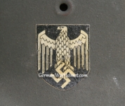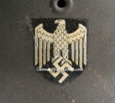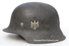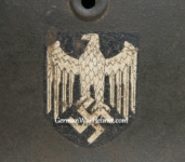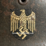 Item H616: Exterior displays moderate wear with approx. 95% of the factory paint remaining. Authentic and factory applied Heer adler decal commensurate with the overall wear and also rates approx. 95%. Super tight fitting liner system 100% original to the helmet. All three untouched split pin rivet fasteners intact and complete with all three slotted washers. Leather liner is undamaged, fully pliable and has taken on a darkened aged appearance. Drawstring in full length. Buckle end of chinstrap is steel with approx. 95% of the gray paint remaining. Long portion of strap is in full length and pliable. Manufacturer and date on tip. Overall excellent condition.Â