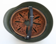 Item H599: This helmet shell is a very large size 68 and although an M35 has been issued in M40 specifications. It has an M40 paint with a single decal which was assembled during the transition from M35 helmets to M40. This helmet never had a National tri-color decal. Exterior paint along with the factory applied Luftwaffe adler decal are in overall very good condition. Liner system 100% original to the helmet. All three untouched split pin rivet fasteners intact and complete with all three slotted washers. Reinforced aluminum liner band manufacturer stamped and dated D.R.P. Schuberth Werke K.-G. Braunschweig 1939. Leather liner is missing some of the tabs. Long portion of strap is missing an inch or two from the tip.