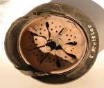 Item H627: Exterior displays battlefield wear with approx 75% of the factory paint remaining. There is what appears to be a small arms bullet strike which left an indentation on the left side. There is also a circular spot of white paint on the left side. When that occurred is anyone’s guess. The factory applied and correct Quist style runic decal is approx 80%. Super tight fitting liner system 100% original to the helmet. All three untouched split pin rivet fasteners intact and complete with all three slotted washers. Leather liner is undamaged, somewhere between pliable and stiff, and has taken on a darkened aged appearance. The entire drawstring is there but has broken. I wouldn’t recommend replacing it because it is part of the helmets history. Buckle end of chinstrap is steel. Long portion of strap is in full length, somewhere between pliable and stiff, manufacturer and 1940 date on tip. The next awesome part of this helmet is it the fact that it’s named to Walter Schmitt and has the Feldpost Nr scratched on the rear of the flared edge. It was hard to capture completely in photographs but most of it can be seen below. I’m positive someone can research it in the archives and find more information on Schmitt and the battles he engaged in.