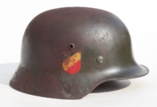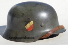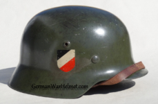 Item H581: Here is a nice and desirable M35 and a Quist helmet which collectors admire more. Exterior displays moderate wear with the typical smooth parade green paint which is approx 85%. Both authentic and factory applied decals have survived in much better condition. The Herr adler “Bigfoot” decal rates approx 90%. The National tri-color decal displays a very nice crazing and rates between 85-90%. Super tight fitting liner system 100% original to the helmet. All three untouched split pin rivet fasteners intact and complete with all three slotted washers. Reinforced aluminum liner band dated 1938. Goat skin leather liner is undamaged, fully pliable and has taken on a darkened aged appearance. Original drawstring in place. Overall good condition.