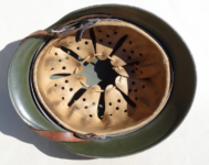 Item H493: From the Veteran’s nephew in Delaware, Ohio. Unfortunately no provenance. Also came with the US M1 and 1937 cap Item: H495 listed above. Here is an excellent, high quality, top shelf tri-color camo helmet which collectors describe with a coined term, “Normandy Camo”. The exterior displays very moderate wear with green, tan and brick red paint which rates approx 95+%. There is no decal that I can detect. A light ring around the upper circumference is indicative to a stacking ring. Super tight fitting liner system 100% original to the helmet. All three untouched split pin rivet fasteners intact and complete with all three slotted washers. Sheep skin leather liner is undamaged, fully pliable and has taken on a darkened aged appearance. Original drawstring in full length with factory knot still in place. Very clear and crisp quality control ink stamp on interior dome of helmet. Buckle end of chinstrap is steel with approx 50% of the gray paint remaining. Long portion of strap is in full length and pliable. Manufacturer and date on tip are indiscernible. A couple of small pieces of string are tied on the liner band which lead me to believe the helmet may have had a net on it at some point in time. Overall excellent, high quality, top shelf condition.