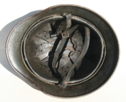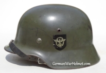 Item H267: Here is a genuine bonafide untouched double decal SS helmet as it was issued right from the factory that has seen actual carnage on the battlefield. This helmet has been in my personal collection for roughly 11 years. It is an indirect Veteran purchase out of Downingtown, Pennsylvania. Unfortunately no Veteran provenance provided. Exterior does exhibit some front line wear and tear but is still in terrific collectible condition. The pea green paint is approx 92-94%. Whitewash may have been applied at one time as there are remnants of a white substance in areas throughout the helmet. Both authentic and factory period applied decals are commensurate with each other. Correct style “Q” pattern runic decal. Liner system 100% original to the helmet. All three untouched split pin rivet fasteners intact and complete with all three slotted washers. Reinforced aluminum liner band manufacturer stamped and dated D.R.P. Schuberth-Werke K.-G. Braunschweig 1938. Leather liner fully pliable, undamaged and has taken on a darkened aged appearance. Drawstring in full length with original knot still in place. Buckle end of chinstrap is aluminum. Long portion of strap is fully pliable and in its entire length. Manufacturer and date on tip 1939. Overall very good condition