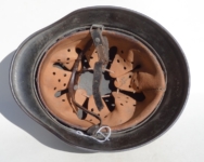 Item H502: Here is a rather hard to find and desirable helmet in a very large size 68. Exterior displays moderate wear with approx 90% of the factory feldgrau (field gray) paint remaining. Authentic and factory applied Heer adler decal slightly better in condition and rates approx 95%. Liner system 100% original to the helmet. All three untouched split pin rivet fasteners intact and complete with all three slotted washers. Pig skin leather liner is undamaged, fully pliable and has taken on a darkened aged appearance. Buckle end of chinstrap is aluminum. Long portion of strap is fully pliable but missing an inch or two from the tip which was period cut down to accommodate the soldier. Overall very good condition.