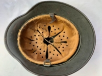 Item H484: Exterior displays very light wear with approx 97% of the factory feldgrau paint remaining. Super tight fitting liner system 100% original to the helmet. All three untouched split pin rivet fasteners intact and complete with all three slotted washers. Pig skin leather liner is undamaged, fully pliable and has taken on a darkened aged appearance. Partial quality control dome stamp in ink on interior crown of helmet. Buckle end of chinstrap is steel with approx 95% of the gray paint remaining. Long portion of strap is in full length and pliable. Manufacturer and date on tip are indiscernible. Overall excellent condition.