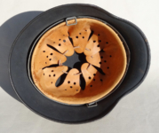 Item H600: Exterior schiefergrau factory paint rates approximately 97% with only Veteran storage abrasions and transfer marks evident. Authentic and factory applied Luftwaffe adler decal rates approximately 95%. Tight fitting liner system 100% original to the helmet. All three untouched split pin rivet fasteners intact and complete with all three slotted washers. Sheep skin leather liner is undamaged, fully pliable and still exhibits a nice creamy appearance. Overall excellent condition.