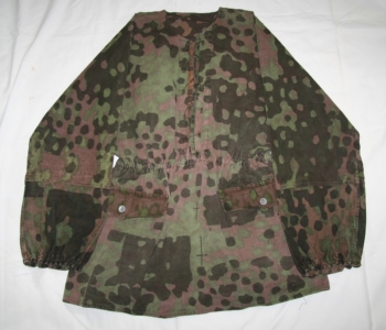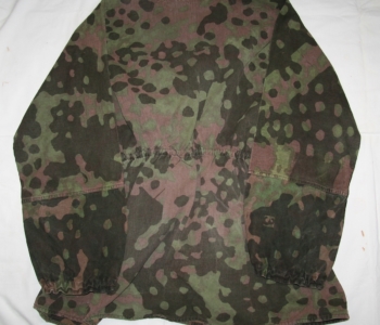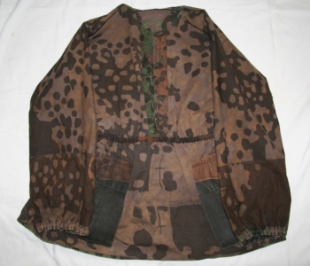 From my own personal collection that was acquired from Mike Beaver back in the 1990’s. Excellent condition. No rips, tears or holes. Foliage loops were removed to keep from snagging brush. Neck enclosure has the vertical openings. There is a similar smock in Mike Beaver’s 3 “Uniforms of the Waffen SS.” It is photographed in Volume 3, the camouflage book page 847.