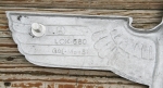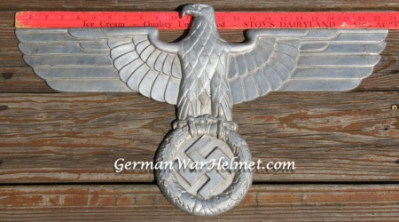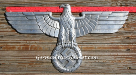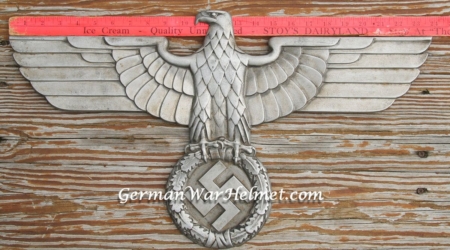 27 1/4 inches from tip to tip. Maker mark with letters GA over H within a circle are partially visible on the right side reverse of the wing. Element compounds GAL-Mg-Si (Galvanized Aluminum, Magnesium and Silicone) are also partially visible on the left side reverse of the wing. In the center of the eagle are the abbreviations LOK=Locomotive, BLN=Berlin, RZA 4=Reich Zug Adler (Train Eagle), All four attachment studs remaining. Overall excellent condition.