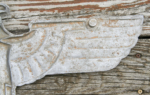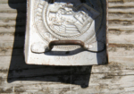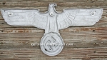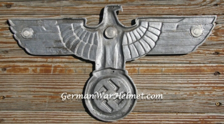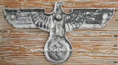Here is a harder to find GPH Railroad Eagle. The eagle measures approx 24 inches from wing tip to tip. Lugs have been period sawed off by souvenir hunting GI for removal from railway/boxcar. GPH manufacturer stamp is on the reverse inside a small circle. Compound elements are also stamped on the wing to the left of the maker mark GAL-Mg-Si (Gal=Galvanized Aluminum, Mg=Magnesium, Si=Silicone). Stamped in the center of the eagle are the abbreviations LOK=Locomotive, RZA 4=Reich Zug Adler (Train Eagle), BLN=Berlin. There is a drilled out hole in the eye and the top of the wreath for mounting in someone’s display den. The holes can be easily repaired with putty. No collection is complete without one to hang over your military memorabilia.
