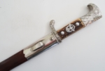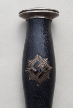 Reichsluftschutzbund or RLB was the official air raid protection group for the state. It was established by Air Minister, Hermann Göring in 1935. RLB groups were kept busy training the German population for civil defense. Beginning in 1936, enlisted members of this organization were issued a dagger. Dagger has a very nice patina over the nickle fittings. Leather wrap on handle and scabbard in excellent condition. Handle is tight and not loose. Small chip in the enamel swastika on handle. Blade in excellent condition with no chips or pitting. Very bold and bright manufacturer etch Paul Weyersberg & Co. Leather bushing still in place at base of blade. Lower fitting on scabbard is missing one screw. Overall excellent condition.