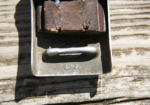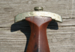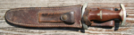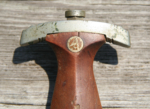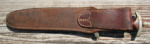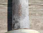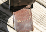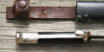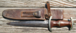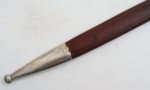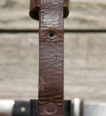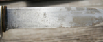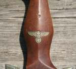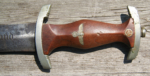 Here we have a Model 1933 SA Dagger (Sturmabteilung Dienstdolch) by Solinger Axt und Hauerfabrik. The blade exhibits oxidation with the tip having been reshaped. The dark and crisp, acid etched “Alles fur Deutschland” motto and “Solinger Axt und Hauerfabrik” manufacturer’s mark are both very distinct. Both nickel crossguards display a nice patina. The lower crossguard is Gau stamped “Wf” (Westfalen). The grip has suffered a crack. The solid nickel eagle is beautifully detailed and has a perfect fit. The SA roundel is also a perfect fit. Top nut matches the top crossguard in patina. The leather scabbard belongs to a different edged weapon. My best estimate would be a Bowie knife. Keep the dagger as is or use it for parts. This is as found condition.