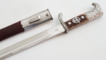 Sturmabteilung or SA was the Nazi Party‘s original paramilitary wing. It played a significant role in Adolf Hitler’s rise to power in the 1920s and 1930s. Its primary purposes were providing protection for Nazi rallies and assemblies, disrupting the meetings of opposing parties, fighting against the paramilitary units of the opposing parties. Dagger exhibits a light patina. Handle fits tight within the nickle crossguards. It also has the SA logo button and Partei eagle firmly attached. Lower crossguard has the district or Gau designation BO which is Bayerische Ostmark. Blade has an excellent etch Alles fur Deutschland which translated is All for Germany. Etch still retains a nice burnishing. Blade is undamaged with fine Otto Simon manufacturer etch. Scabbard is anodized which shows some light lacquer loss. No dents to scabbard or to ball on lower fitting. Scabbard has nickel fittings. Lower fitting is missing one screw. Leather hanger and clip in perfect condition. Overall very good to excellent condition