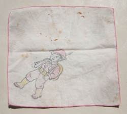 Flag is constructed of silk with written well wishes, war slogans and signatures from friends & family. Approx size is 30″ x 28″.