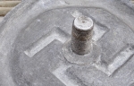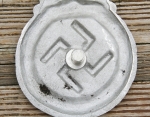 I picked up this Hitler Youth drum in Germany close to 20 years ago. It’s diameter is roughly 14 1/2 inches and 6 3/4 inches tall. The aluminum ring sports the red and white triangles which signify Hitler Youth. The drum heads are calfskin which are in perfect functioning condition. Tensioned springs on reverse give it the snare drum sound. Leg support is still period wrapped with cloth for comfort while walking and beating a drum for hours. Brass center has manufacturer stamp in Erfurt, Germany. The F.T.E. 4 I’m unsure of but can possibly be a group designation. Overall condition is very good and everything functions perfectly.