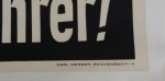 German portrait of Adolf Hitler by Carl Werner, Reinchenbach I.V. Print is in excellent condition with matted background. Zero tears or creases in print. Very high quality. Overall measurements are 48 1/2 inches x 35 1/2 inches. Print measures 46 1/2 inches x 33 1/2 inches. Ein Volk, ein Reich, ein Führer translates to one people, one realm, one leader.