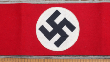 Banner measures roughly 30 inches in length X 22 1/2 inches in height. It is a 2 piece construction with the white disk and insignia sewn on the red banner. Material is cotton. This NSDAP banner is in near perfect condition. No rips, holes, tears or soiling. Hard to upgrade. Overall near mint.