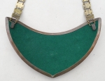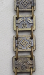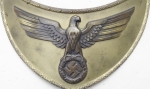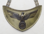 Gorget is in excellent condition and shows a nice patina. Front of Political Leader gorget has a very detailed oak leaf trim. Eagle with outstretched wings and clutching an oak leaf circle with mobile swastika also displays great detail. Reverse felt has zero moth damage. Each clip is RZM manufacturer stamped M 1/14 which is Matth. Oescbsler & Sohn, Ansbach. The chain is RZM manufacturer stamped M 1/128 which is Eugen Schmidh ussler, Pforzheim. Each link has an alternating Eagle then Swastika. Overall excellent condition.