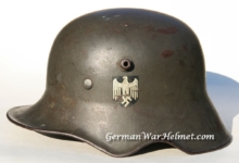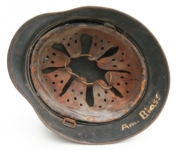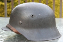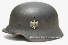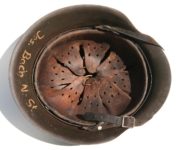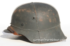 Item H387: Here is a hard to find WWI Ear Cut Out helmet that has been reissued during WWII. Exterior displays approx 96% of the factory feldgrau (field gray) paint remaining. Authentic and depot applied Heer adler decal rates approx 93%. Super tight fitting liner system 100% original to the helmet. All three untouched split pin rivet fasteners intact and complete with all three slotted washers. Sheep skin leather liner fully pliable, undamaged and has taken on a darkened aged appearance. Authentic drawstring in place. Buckle end of chinstrap is steel with approx 50% of the gray paint remaining. Long portion of strap is pliable but has been period cut down to accommodate the soldier. There are also several names on the liner that have been crossed out. This is very typical among re issued helmets which this is. Overall very good condition.