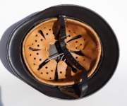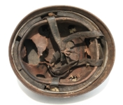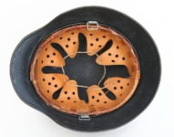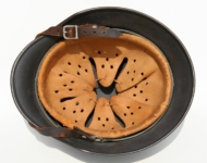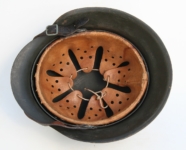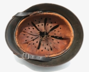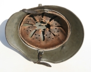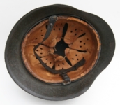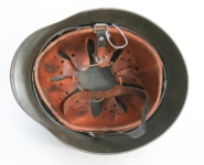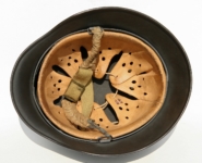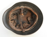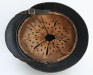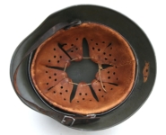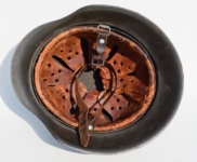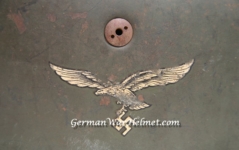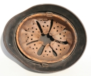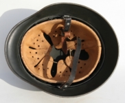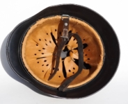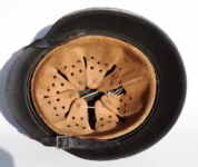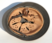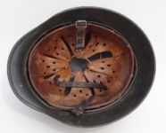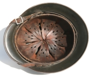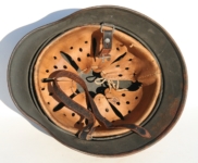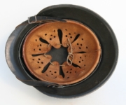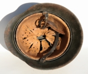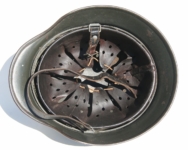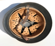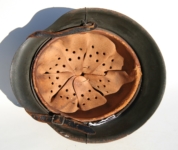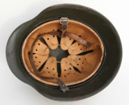 [Item: H122] Exterior displays approx 96% of the factory feldgrau paint. Authentic and factory applied Luftwaffe adler decal approx 96% as well. Liner system fastened with the early style steel spanner bolts. Each of the 4 bolts has 2 collared nuts affixed to them which are untouched (see attached photos). Black foam pads are stiff with slight give which is what you would want to see. Leather liner has darkened from age. It does not appear to have been treated with a protective coating by a previous owner. I believe it may have been pomade or similar hair wax worn by the soldier. Chinstrap harness is complete with no loose stitching. Overall very good condition.