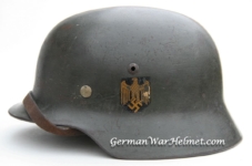 Item H288 Another one from my personal collection. Overall excellent condition. Exterior displays 98% of the factory feldgrau (field gray) paint. Both authentic and period applied decals commensurate. Super tight fitting liner system 100% original to the helmet. All three untouched split pin rivet fasteners intact and complete with all three slotted washers. Goat skin leather liner fully pliable, undamaged and has taken on a darkened aged appearance. Buckle end of the chinstrap is the correct aluminum. Long portion of strap is in full length and pliable. Manufacturer and 1938 date on tip. Quality control ink stamp visible on interior crown of helmet dated 1939. Name of the German soldier written on the rear of the flange. Another high grade named helmet. These do not become available often.