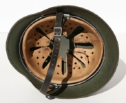 Item H432: Exterior displays very light wear with approx 96% of the factory paint remaining. Authentic and factory applied Heer adler decal commensurate with the overall wear and also rates approx 96%. Super tight fitting liner system is 100% original to the helmet. All three untouched split pin rivet fasteners intact and complete with all three slotted washers. Goat skin leather liner fully pliable, undamaged and has taken on a darkened aged appearance which has been treated by a previous owner. Liner also features a splice at the 10 o’clock position and the less common 8 1/2 tabs. Drawstring in full length. Buckle end of chinstrap is steel with approx 95% of the gray paint remaining. Long portion of strap is in full length and pliable. Manufacturer and 1941 date on tip. Overall excellent condition.