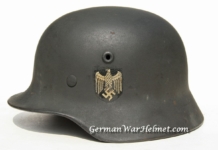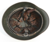 Item H428: Exterior displays approx 96% of the factory feldgrau (field gray) paint. Authentic and factory applied Heer adler decal rates in better condition at approx 98+%. Super tight fitting liner system 100% original to the helmet. All three untouched split pin rivet fasteners intact and complete with all three slotted washers. Goat skin leather liner fully pliable, undamaged and still retains a nice creamy appearance. Drawstring in full length with original knot in place. Very crisp and clear quality control ink stamp visible on interior crown of helmet. Chinstrap buckle is steel with approx 98% of the gray paint remaining. Long portion of strap is in full length and pliable. Manufacturer and 1942 date on tip. Overall excellent condition.
