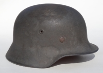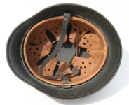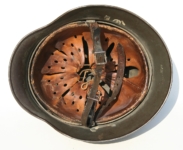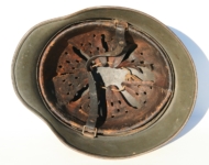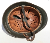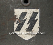 Item: H214 This is a totally untouched example and came out of the “Woodwork” from Massachusetts in May of 2009. Since I’m now keeping the M35 ET64 Waffen SS Helmet that was previously for sale, I decided to let this one go from my personal collection. Exterior displays moderate wear with approx 94% of the factory paint remaining. Both authentic and factory applied decals commensurate with the overall wear and in fantastic condition. Runic decal approx 96% while the Party decal rates just a smidgen less at 94%. Beautiful crazing to both decals clearly visible. Liner system 100% original to the helmet. All three untouched split pin rivet fasteners intact and complete with all three slotted washers. Reinforced aluminum liner band manufacturer stamped and dated Werner Zahn 1939. Goat skin leather liner fully pliable, undamaged and has taken on a darkened aged appearance. Drawstring in full length with original knot still in place. Buckle end of chinstrap is steel. Long portion of strap is in full length and pliable. Manufacturer and date on tip is visible but indiscernible. Quality control ink stamp visible on interior crown of helmet. Overall very good condition.
