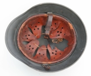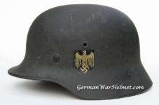 Item: H260 Exterior displays a period Depot hand brushed over re-issue. The Kriegsmarine decal has either been masked off or carefully painted around while the Tri-color decal has been meticulously removed given the 1940 regulations. The Navy decal permeates the correct 3-D style application. Liner system 100% original to the helmet. All three untouched split pin rivet fasteners intact and complete with all three slotted washers. Goat skin leather liner fully pliable, undamaged and has taken on a darkened aged appearance. Buckle end of the chinstrap is the correct aluminum. Long portion of strap is in full length and pliable. Manufacturer and date on tip is indiscernible. Overall excellent condition.