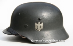Item H462: Excellent high grade condition. Exterior displays approx 98% of the factory rough texture feldgrau paint. Authentic and factory applied Heer adler decal commensurate with the overall wear and also comes in at approx 98%. Super tight fitting liner system 100% original to the helmet. All three untouched split pin rivet fasteners intact and complete with all three slotted washers. Goat skin leather liner fully pliable, undamaged and has taken on a darkened aged appearance. One of the air holes on the leather liner has not been completely punched through and just hanging on which also indicates minimal usage. Drawstring in full length with original knot still in place. Buckle end of chinstrap is steel with also approx 98% of the gray paint remaining. Long portion of chinstrap in complete length and fully pliable with manufacturer and 1940 date clearly on tip. This is a nearly unissued German Army helmet in fabulous condition.