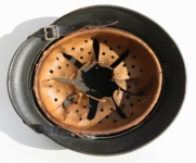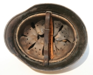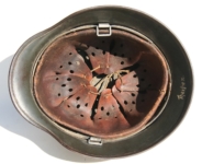 Item H430: Here is another hard to find M35 helmet that was partially assembled to M40 specs. The original factory smooth parade paint can be seen under areas of the matte finish. Obviously assembled during the transition from M35 to M40. Single decal Kriegsmarine decal is the correct ET style which has that layered 3D effect. No National tri-color decal can be seen on the opposite side because it never had one. Liner band and rivets original to the helmet. Two rivets are dated 1939 and the third rivet dates 1940 which also distinguishes this helmet to be a single decal issued M35. The helmet also features a light quality control ink stamp visible on interior crown of helmet.
