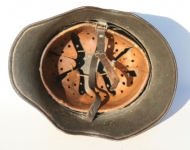 Item H414: Exterior displays almost zero wear with approx 99% of the factory schiefergrau (slate gray) paint remaining. Only very minor storage transfer abrasions evident. Authentic and factory applied Luftwaffe adler decal nearly 100%. Super tight fitting liner system 100% original to the helmet. All three untouched split pin rivet fasteners intact and complete with all three slotted washers. Pig skin leather liner fully pliable, undamaged and still exhibits a slightly creamy appearance. Drawstring in full length with original knot in place and also features sealant still on both of the tips. Buckle end of chinstrap is steel with nearly 100% of the gray paint intact. Long portion of strap is in full length and pliable. Manufacturer and date on tip. Overall excellent top shelf condition.