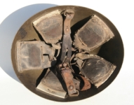 Item H461: Exterior displays very light wear with approx 97% of the factory feldgrau paint remaining. Authentic and factory applied “Bigfoot” decal commensurate with the overall wear and also rates approx 97%. Small bulge from the inside toward the outside caused by an unknown source. Split pin rivet fasteners original and ready to accept a replacement liner if the new owner wishes to do so. Despite the missing liner I would still rate this in excellent condition.