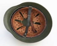 Item H434: Exterior displays very minimal wear with only storage abrasions evident. Approx 98% of the factory paint remaining. Authentic and factory applied Heer adler decal commensurate with the overall wear and also rates approx 98%. Super tight liner system 100% original to the helmet. All three untouched split pin rivet fasteners intact and complete with all three slotted washers. Sheep skin leather liner fully pliable, undamaged and still exhibits a slightly creamy appearance. Drawstring in full length with original knot in place and also features sealant still on one of the tips. Very crisp and clear quality control ink stamp visible on interior crown of helmet. Buckle end of chinstrap is aluminum. Long portion of strap is fully pliable but missing an inch or two from the tip which was period cut down to accommodate the soldier. Overall excellent condition.